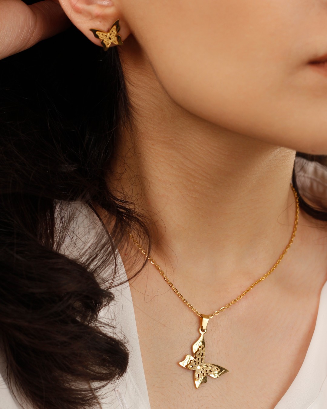 نیم ست پروانه از جنس استنلس استیل دو روآبکاری میباشد و بدون حساسیت و رنگ ثابت است وزن این گردنبند9 گرم است و طول این گردنبند 50 سانتی متر میباشد. وزن گوشواره 5 گرم میباشد.